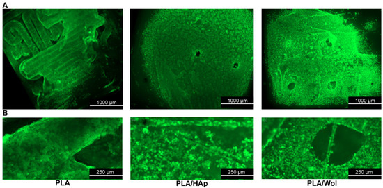 MSCs colonization of PLA-based sample surfaces: (A) ×2.5 magnification; (B) ×4 magnification.