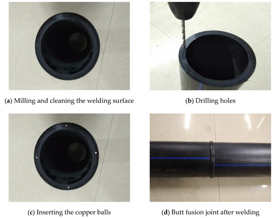 HDPE pipes made from PE100 were used in this study. They had an outer diameter of 200 mm and SDR (the ratio of the outer diameter to the wall thickness) of 11. The melting temperature, Tm, was 131 °C, the crystallization temperature, Tc, was 117 °C, and the degree of crystallinity was 67%. The yield stress was 22.2 MPa, the Poisson’s ratio was 0.4, and Young’s modulus was 1314 MPa at an air temperature of 28 °C. The HDPE pipes were welded according to ISO 21307 [23] and the welding parameters are shown in Table 1. The welding was performed on a butt fusion welding machine (HDC160–315, Zhuji Huida Pipeline Technology Co. Ltd., Zhuji, China). More details on the welding process can be found in ISO 21307 [23]. Copper balls were inserted into the welding surface before welding in order to simulate welding defects such as holes or inclusions. The steps of inserting the copper balls are shown in Figure 1a: milling and cleaning the welding surface; Figure 1b drilling holes in the center of the welding surface (the diameter of the holes was identical to that of the copper balls); Figure 1c inserting the copper balls; Figure 1d creating the butt fusion joint after welding. The ratios of the diameter of the copper balls to the thickness of the pipe wall were 0%, 16%, 33%, and 44%, respectively. Here, 0% indicates that there was no welding defect in the joint. Four copper balls were inserted into the joint to prepare enough specimens in one joint and reduce the effect of welding quality on the test results. The defect sizes are listed in Table 2.