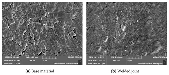 Samples were prepared from the base material and the welded joint of the HDPE pipe to research their microstructure. The samples were polished using an ion beam and then analyzed using a scanning electron microscope (SEM, TESCAN MIRA 3, Brno, Czech Republic). The results are shown in Figure 2. As shown in Figure 2a, there are numerous lamellae in the base material. However, the lamellae were almost not present in the welded joint, as shown in Figure 2b. Therefore, it could be deduced that the weld joint was harder and more brittle than the base material.