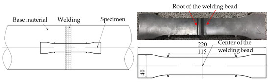 The creep specimens were processed according to EN 12814–3 [24]. The welding bead was located in the middle of the specimen and the welding defect was in the center of the welding bead. The processing method and dimensions of the creep specimens are shown in Figure 3.