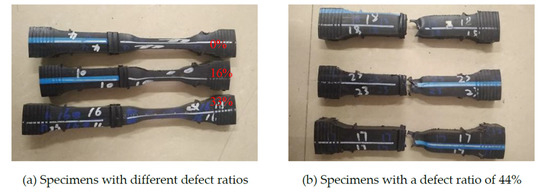 For specimens with a welding bead, the experimental results showed that the specimens with defect ratios of 0%, 16% and 33% necked in the base material, as shown in Figure 4a. The reason for this was that the stress concentration in the root of the welding bead, as shown in Figure 3, did not damage the ductile failure of the joint [3] and the joint region was harder than the base material. Therefore, necking appeared in the base material. However, a brittle fracture was found to occur at the joint for all specimens with a defect ratio of 44%, as shown in Figure 4b. One reason was that the joint was subjected to greater stress than the base material because the defect ratio of 44% significantly reduced the cross-sectional area of the joint.