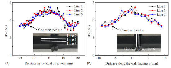 The Vickers hardness was tested to research the distribution of hardness in the HDPE pipe’s welded joint. The hardness was tested using a hardmeter (HV-1000Z, Shanghai Precision Instruments Co. Ltd., Shanghai, China). Tests were carried out at air room temperature (25 °C). A load of 0.005 kgf was applied and held for 10 s during the test. The values of the hardness of the joint are shown in Figure 5, where the distance of 0 mm means that the hardness was measured in the center of the joint or the pipe wall. The hardness was measured in the axial direction (lines 1–3: from left to right) and the thickness direction (lines 4–6: from the bottom up) respectively, as shown in Figure 5. Line 1 was located in the center of the thickness of the wall and line 5 was located in the center of the joint; the distance between the two lines was 1 mm. As shown in Figure 5a, the greatest hardness was located in the middle of the joint and then the hardness slowly decreased to a constant value in the axial direction. A constant value of hardness appeared in the base material, at about 20 mm away from the middle of the joint. The highest value of hardness was about 1.7 times larger than the constant value. The hardness slowly increased to the largest value and then decreased from the inside to the outside of the thickness of the wall, as shown in Figure 5b. The reason was that the material was squeezed into the two sides of the pipe wall under pressure during the welding process. In this way, the material in the middle of the wall was subjected to the greatest pressure. Therefore, the center of the joint had the highest value of hardness. This means that the center of the joint was more brittle than other regions and is the reason why a brittle fracture appeared in the joint, as shown in Figure 4b.