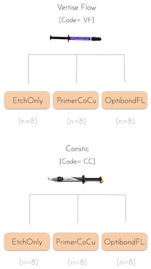 For the bond strength study, 48 teeth were randomly assigned to six different groups (n = 8), depending on the composite used and the bonding strategy employed (Figure 1 and Table 2). As for the bonding strategy variable, a group in which only etching was employed as a negative control group, while a group featuring a full conventional etch-and-rinse protocol was used as a positive control for all composites tested (Table 2).