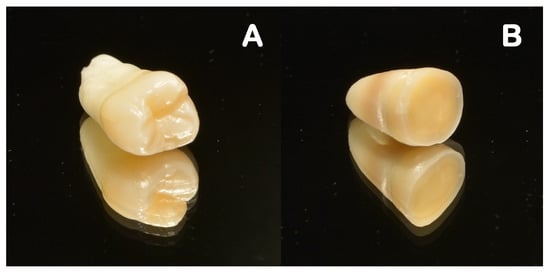 For this laboratory study, approved by the Ethics Committee of Instituto Universitário Egas Moniz (Protocol no. 1063), 66 permanent, sound human molars, which had been recently extracted, were gathered. These were free of carious lesions, restorations, or other structural defects, and were obtained with the patient’s consent. After being scaled and cleaned, the teeth were stored in 1% chloramine T (v/v) at 4 °C for one week, and then stored in distilled water, replaced every week, until they were used. All the molars were used within 6 months after their extraction.