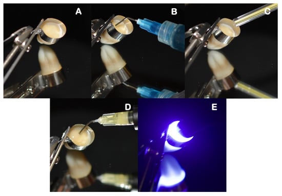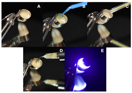 Restorative procedure of the etch-only group, where: (A) is the application of restorative matrix band, (B) etching protocol, (C) rinsing and drying step, (D) application of the flowable self-adhesive composite, and (E) light curing of each increment.