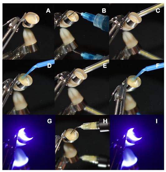Restorative procedure of the Optibond FL (full etch-and-rinse) group, where: (A) is the application of the restorative matrix band, (B) etching protocol, (C) rinsing and drying step, (D) application of the primer (part I), (E) drying step, (F) application of the bond (part II), (G) light curing of the adhesive, (H) application of the flowable self-adhesive composite, and (I) light curing of each increment.