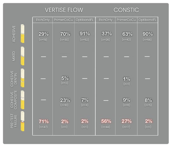 The EtchOnly groups revealed the majority of pre-test failures (>50%), substantiating the low bond strength depicted in Figure 5. The groups where the primer and co-curing strategy were used, or where OptiBond FL was used, revealed far fewer pre-test failures and a higher adhesive failure distribution among the samples.