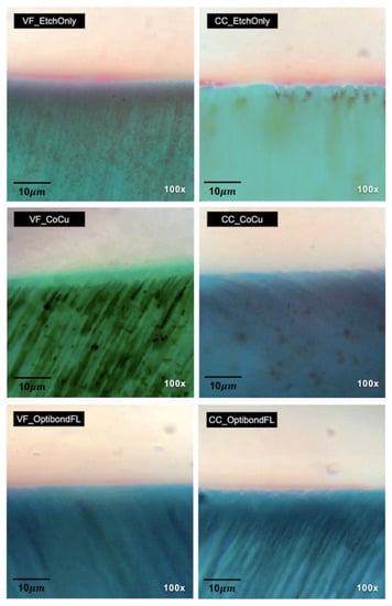 Representative light micrographs of the composite–dentin interfaces, stained with Masson’s trichrome, where: mineralized dentin can be seen in green; the self-adhesive composite or composite/adhesive is shown in light beige, with filler; while the exposed collagen is in red. A greater degree of exposed collagen can be clearly identified in sections belonging to specimens etched with orthophosphoric acid (VF_EtchOnly, CC_EtchOnly). Sections restored with OptiBond FL show less collagen exposure, but which is still visible, while primer and co-curing groups show no visible collagen exposure in the analyzed samples. Original magnification at 100× is shown.