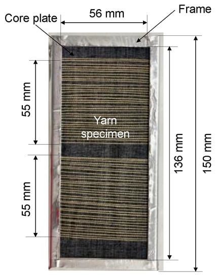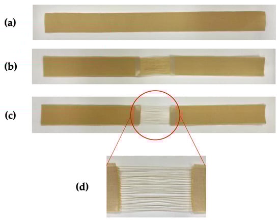 The spun yarns for UV exposure were two-ply spun yarns in warp direction sampled from fabrics used in the tensile test of firefighter clothing outer layers [9]. Table 1 shows the specification of yarn samples for tests. The yarns were made of 100% m-Aramid, 100% p-Aramid, and a blend of m-Aramid and p-Aramid. Figure 1 shows the procedure for fabricating a 500 mm long spun yarn specimen. Since the UV exposure conditions shall be the same as those of the three-layer fabric of firefighter clothing, the yarn specimens were layered in the order of yarn specimen, moisture barrier, and thermal liner from the top, as shown in Figure 2. Specimen preparation is consistent with the one for fabrics [9].