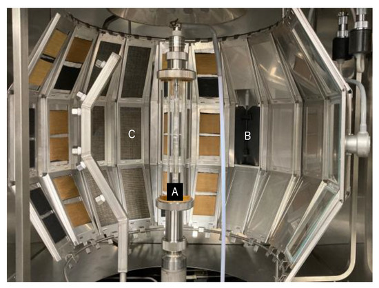 Figure 3 shows the test frame mounted in a sample holder in the chamber of the xenon-arc weathering meter. The letters A, B, and C in Figure 3 represent a specimen rack with a xenon arc lamp, a black panel thermometer, and two yarn specimens for exposure, respectively. Conditions of UV exposure shown in Table 2 were determined based on ISO 4892-2 [11], JIS D 0205:1987 [12], and the annual average of 12.08 h [13] of direct solar radiation per day in Japan. Based on these assumptions, the UV exposure energy at the wavelengths was determined to be 34 MJ/m2 [9]. The UV exposure time was determined using the output of a xenon arc lamp, based on Equation (1). The UV exposure energy of 340 MJ/m2 assumes that firefighter clothing will be used for ten years [9].