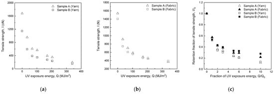Figure 4a,b show a comparison of the tensile strength (I) of yarns and fabrics of samples A and B against UV exposure energy (Q). The tensile strength (I) of yarns and fabrics decreases exponentially with UV exposure energy (Q). However, the tensile strength of yarns of samples A and B is affected by the yarn size, while the effect of yarn size is not significant for the woven fabrics for UV exposure energies above Q = 102 MJ/m2.