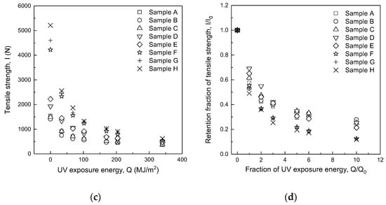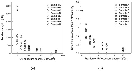 Equation (3) is the equation for curve-fitting between the fraction of UV exposure energy (Q/Q0) and the retention fraction of tensile strength (I/I0) [9]. The retention fraction of tensile strength (I/I0) decreases exponentially with increasing the fraction of UV exposure energy (Q/Q0) and can be expressed as . Therefore, due to UV exposure, a higher degradation coefficient of yarn () is the rapid loss of tensile strength.