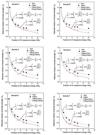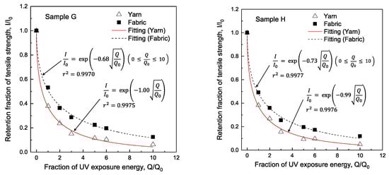 Figure 6 shows the relationship between the fraction of UV exposure energy (Q/Q0) and the retention fraction of tensile strength (I/I0) for all samples. Each graph includes the curve-fitting results. In addition, Figure 6 contains the fitting results for woven fabrics. The solid red line in each graph represents the fitting results for yarn, and the black dotted line represents the fitting results for woven fabrics.