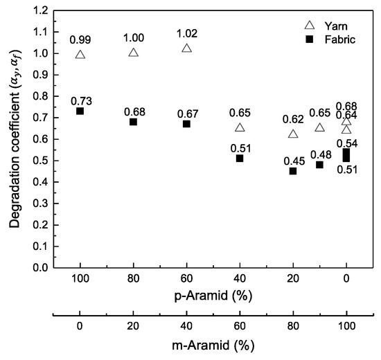 Relationship between degradation coefficient of yarn and fabric ( and ) by the blend of m-Aramid/p-Aramid based on Equation (3).