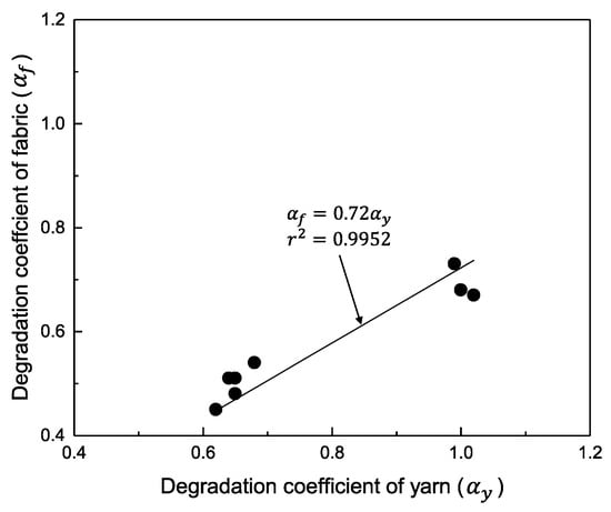 Figure 8 shows the results of the correlation and linear regression of the degradation coefficients ( and ) for spun yarn and woven fabrics. The degradation coefficients ( and ) of spun yarn and woven fabrics are proportional, with a slope of 0.72 and a correlation coefficient r2 of 0.9952. Therefore, the estimation of the tensile strength of fabrics from yarns to fabrics in this study can be made by applying the coefficients obtained from the linear regression shown in Figure 8 as correction parameters to the degradation coefficients of the tensile strength of yarns. The results indicate that it is possible to predict the tensile strength of UV-exposed fabrics by examining the tensile strength of yarns to UV exposure.