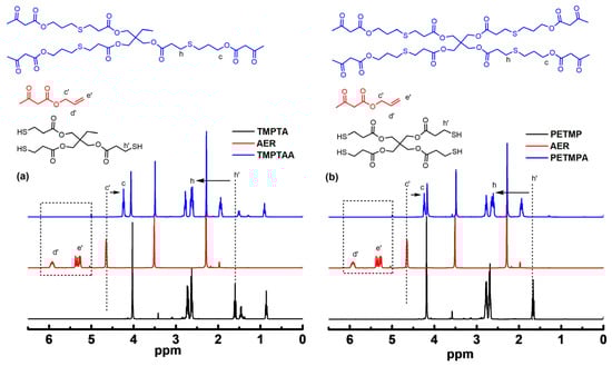 (a) 1H NMR of TMPTA, PETMP, allyl acetoacetate and TMPTAA, (b) 1H NMR of TMPTA, PETMP, allyl acetoacetate and PETMPA.