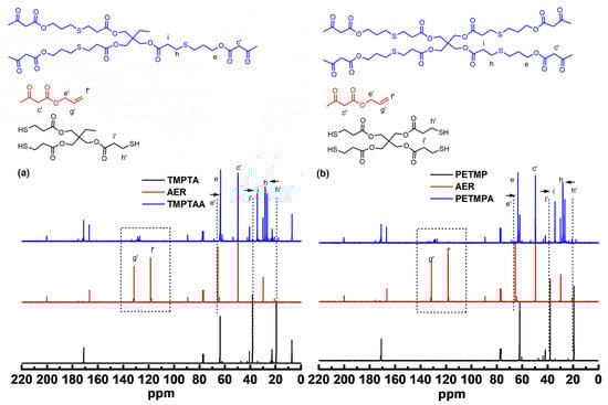 Further, the 13C NMR spectra of TMPTAA and PETMPA is shown in Figure 2. After the thiol-click reaction between AER and TMPTA, the peak position changed. Specifically, the C=C bond signal peaks g’ and f’ of AER at 131 ppm and 181 ppm disappeared, while the methylene signal peak e’ adjacent to the AER ester group at 65 ppm shifted to 63 ppm. Further, the methylene signal peak h’ next to the TMPTA thiol group at 19 ppm shifted to 28 ppm, and the methylene signal peak i’ near the TMPTA carbonyl group at 38 ppm shifted to 35 ppm. Similar changes in the NMR signal peaks occurred in PETMPA. These results showed that the thiol-click reaction was performed, and the acetoacetate-functionalized TMPTAA and PETMPA were prepared.