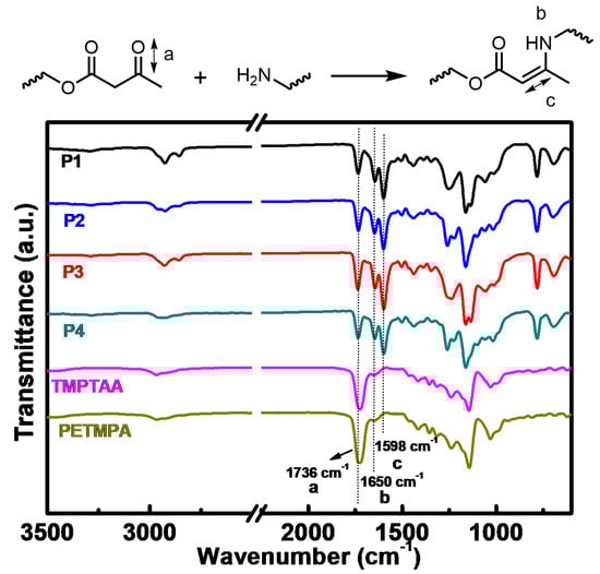 The chemical structure of the TMPTAA, PETMPA and four polymer networks were characterized by FT-IR and are shown in Figure 3. Although all films showed similar characteristic IR absorption peaks, there were changes in the density and position of several absorption peaks, when compared with monomers. Typically, the peak at 1736 cm−1 (C=O stretching vibration in TMPTAA and PETMPA) was dramatically weakened, and new absorption peaks appeared at 1650 cm−1 (C=C stretching vibration) and 1598 cm−1 (C=O stretching vibration) [,,,]. Further, the detection of the cross-link structure was verified by acetone swelling experiments, where ca. 0.1 g of the polymer network was submerged in acetone, and the swelling rate of the film was measured over time (Figure S1). The films were not dissolved, only swollen, after being immersed for 48 h (see Table 2), demonstrating that the crosslinking films were successfully prepared.