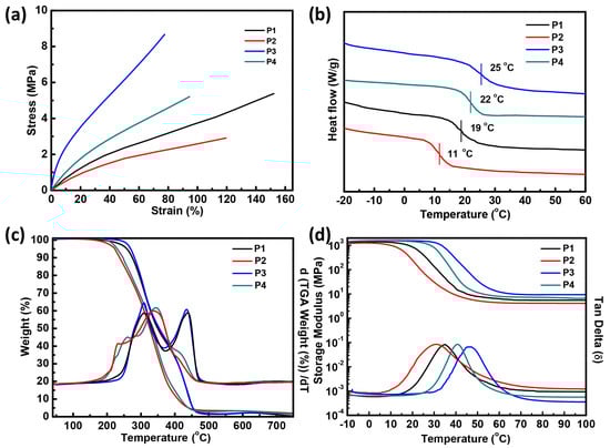 (a) Stress–strain curve, (b) DSC curve, (c) TGA curve and (d) DMA curve of the films.