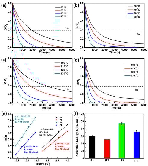 Stress-relaxation measurement was taken to investigate the viscoelasticity of the polymer films and the rate of exchange reactions within the material. The relaxation time τ is defined as the time taken for the material to relax from the initial modulus to 1/e of the initial modulus. Figure 5a–d shows the stress-relaxation curves for the polymer films. The relaxation time for P1 decreased from 1997 s to 343 s as the test temperature increased from 60 °C to 90 °C (Figure 5a), while the relaxation time for P2 decreased from 1211 s to 250 s (Figure 5b). Additionally, as the test temperature increased from 100 °C to 130 °C, the relaxation time decreased from 3487 s to 373 s for P3 (Figure 5c), and from 1110 s to 174 s for P4 (Figure 5d). To deeply study the energy required for the macroscopic flow of the material, the activation energy (Ea) of polymer films was calculated using the Arrhenius equation: τ = τ0 × exp (Ea/RT) [,,,] and is shown in Figure 5c,d. The Ea of the polymer films was in the following order: P3 (94 kJ/mol) > P4 (72 kJ/mol) > P1 (61 kJ/mol) > P2 (51 kJ/mol), demonstrating that the disulfide bond decreased the activation energy for the same type of film system.