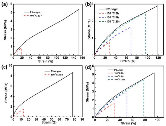 Stress–strain test of the self-healing efficiency of the films: (a) film P1 and (c) film P3 with inefficient stress–strain recovery after 20 h of healing at 100 °C, and (b) film P2 and (d) film P4 with basic recovered stress–strain after 20 h of self-healing at 100 °C.