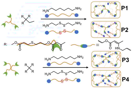 The following supporting information can be downloaded at: https://www.mdpi.com/article/10.3390/polym14193953/s1, Figure S1: Solvent swelling (acetone absorption-time diagram) of P1, P2, P3 and P4; Figure S2: 1H NMR Spectrum of (a) allyl acetoacetate and (b) trimethylolpropane tris(3-mercaptacetoacetate) (TMPTAA) (400 MHz, CDCl3, 7.26 ppm); Figure S3: 1H NMR Spectrum of (a) allyl acetoacetate and (b) pentaerythritol tetra(3-mercaptacetoacetate) (PETMPA) (400 MHz, CDCl3, 7.26 ppm); Figure S4: 1H NMR Spectrum of trimethylolpropane tris(3-mercaptacetoacetate) (TMPTAA) (400 MHz, CDCl3, 7.26 ppm); Figure S5: 13C NMR Spectrum of trimethylolpropane tris(3-mercaptacetoacetate) (TMPTAA) (100 MHz, CDCl3, 77 ppm); Figure S6: 1H NMR Spectrum of pentaerythritol tetra(3-mercaptacetoacetate) (PETMPA) (400 MHz, CDCl3, 7.26 ppm); Figure S7: 13C NMR Spectrum of pentaerythritol tetra(3-mercaptacetoacetate) (PETMPA) (100 MHz, CDCl3, 77 ppm).