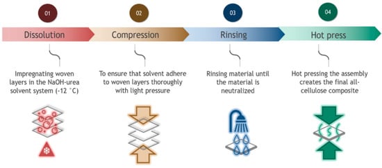 Environmental concerns drive developmental efforts to create sustainable bioproducts, replacing petrochemical plastics with renewable and sustainable resources []. All-cellulose composites (ACCs) are a family of single-polymer composites produced from various cellulosic raw materials, such as wood pulp, plant fibers, cellulose nanofibers, microcrystalline cellulose, and wood-based textiles. An inexhaustible list of end-uses and material classes includes films [,,,,], laminates [,], and aerogels [,]. ACC materials offer a wide range of potential applications, from structural and packing materials to high-value-added engineered electric devices and biomedical purposes [,,,,].