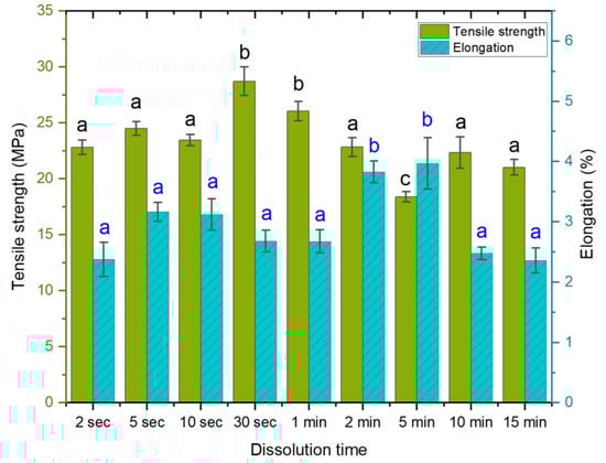 Tensile strength (MPa) and elongation at break (%) as a function of dissolution time. The lettering (black for tensile, blue for elongation) indicates statistical differences between samples divided into groups a, b and c for both properties. The tensile strength of samples with 30 s, 1 min, and 5 min dissolution times differed in comparison to all others. The higher elongation values were noted only in samples with 2 min and 5 min dissolution times in comparison to others.