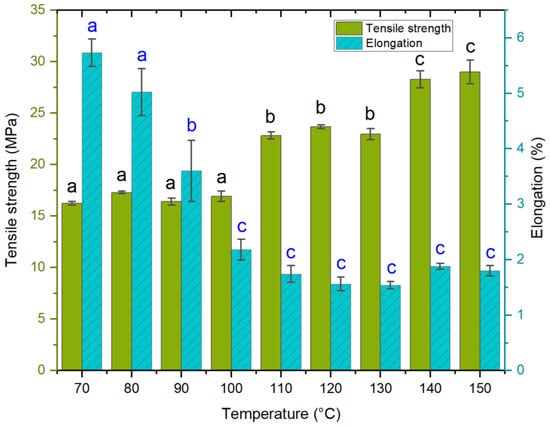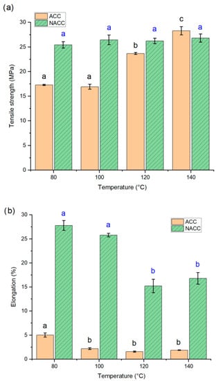 Tensile strength (MPa) and elongation at break (%) (means and standard deviations) as a function of hot press temperature conditions. The lettering (black for tensile, blue for elongation) indicates statistical differences between samples divided into groups a, b and c for both properties. Tensile strength changed in steps, in which samples made ≤ 110 °C (group a) were similar, those made with 110 to 130 °C formed another group (group b), and the highest tensile strength properties (group c) was seen for samples at temperatures of 140 to 150 °C. Conversely, elongation of ACCs was the highest with samples made ≤ 80 °C (group a), with marked decrease already at 90 °C (group b), after which the values plateau (group c).
