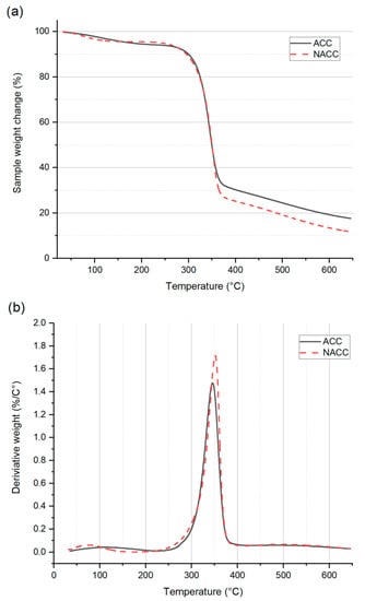 Results of (a) thermogravimetric analysis (TGA) and (b) differential thermogravimetric analysis (DTGA) for all-cellulose composites (ACCs) and all-cellulose composites with TEMPO-oxidized nanocellulose (NACCs).