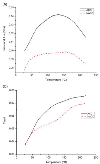 The storage modulus trend for the ACCs and NACCs was similar: the storage modulus decreased linearly as a function of press temperature. This is a common trend shared by all-cellulose materials []. The loss modulus (the energy dissipation associated with the motion of polymer chains) and tan delta (δ) (ratio of loss modulus and storage modulus of polymer composites within the measured temperature range) were both higher for the ACCs. For both the ACCs and NACCs, the tan δ curve showed an upward trend, and neither the ACCs nor the NACCs had a clear peak to indicate the glass transition temperature. Cellulose, like other polymers, undergoes a phase transition from a low-temperature glass state to a higher-temperature elastic state, but the transformation stage is not easily detectable for cellulose [,,]. The results of this study agree with previously identified phenomena [,,].