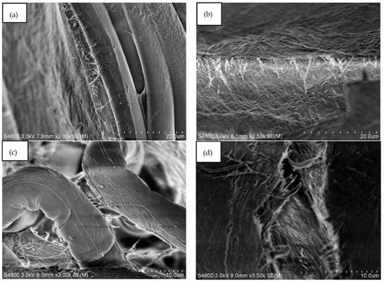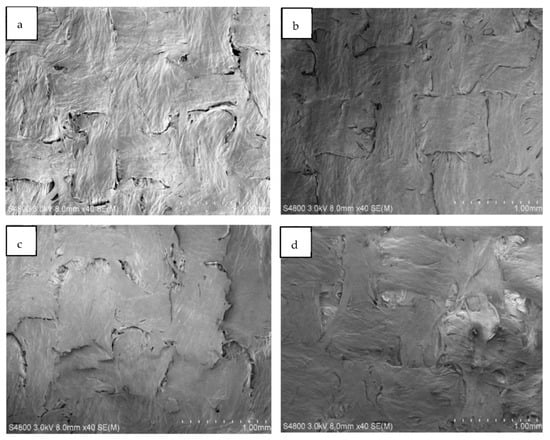 Scanning electron microscope (SEM) images of textile-based NACC laminates. The samples were produced at specific temperatures: (a) 80 °C, (b) 100 °C, (c) 120 °C, and (d) 140 °C.