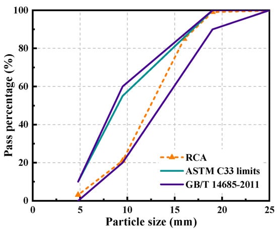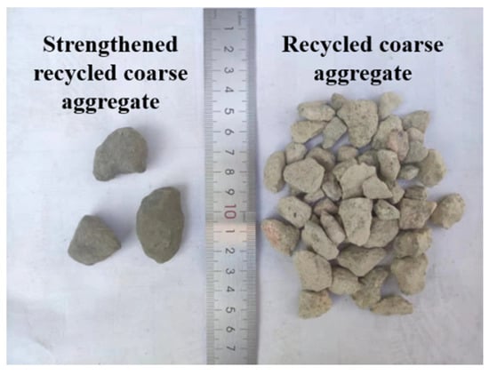RCA was obtained by crushing unknown waste concrete collected from a local C&D waste site in Shenzhen, China. The particle size range of RCA is 5~20 mm, as shown in Figure 1. The bulk density, crushing index, and water absorption of RCA are summarized in Table 1. Strengthened recycled coarse aggregate (SRCA) was prepared by wrapping RCA with a layer of PE fiber-reinforced cementitious slurry. The mixture proportion of the strengthening slurry is summarized in Table 2. Firstly, the cementitious slurry was prepared by mixing cement, fly ash, water and superplasticizer. Then, PE fiber with the properties detailed in Table 3 was added in the mixture. After proper dispersion of fibers, RCA and accelerator solute were placed into the mixer. Once RCAs were completely covered by the fresh slurry, they were pulled out. After air drying for 24 h, SRCA were placed in a 60 °C drying oven for 24 h. The flow chart of the preparation process is illustrated in Figure 2. The obtained SRCAs are shown in Figure 3.
