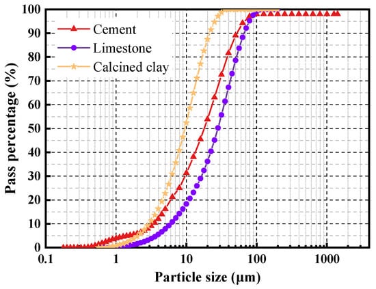 The cement used is OPC 42.5R. LC3 is composed of OPC, calcined clay and limestone. The chemical composition and physical properties of the cementitious materials is presented in Table 4, and the particle size distribution is shown in Figure 4. The Bogue composition of OPC is 57.26% C3S, 15.08% C2S, 9.31% C3A, and 12.46% C4AF. Two replacement ratios of OPC by LC3, 35% and 50%, were investigated. Fine aggregates used in this work are sea sand and desalted sea sand. The detailed properties of fine aggregates are illustrated in Table 5. The studied water types include tap water and seawater, and the main ion contents of the two kinds of water are demonstrated in Table 6.