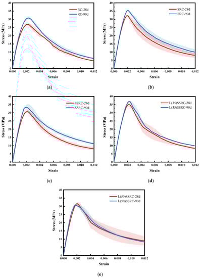 Average stress-strain curves of the five types of concrete at 28 and 90 days (a) RC, (b) SRC, (c) SSRC, (d) L(35)SSRC, and (e) L(50)SSRC.