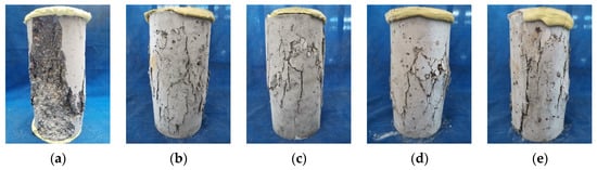 The average stress-strain curves of various concrete cylinders at the age of 28 and 90 days are shown in Figure 5, and the data distribution range is also marked. All the stress-strain curves exhibit three development stages, i.e., linear increasing stage, non-linear rising stage, and descending stage. It is remarked that the mechanical performance of concrete using SRCA is remarkably improved at both 28 and 90 days by comparison with the concrete using untreated RCA. The stress-strain curve of SRC almost covers that of RC, with the strength increasing ratio being 19.34% at 28 days and 15.13% at 90 days. According to the failure modes of concrete, demonstrated in Figure 6, the concrete blocks are peeled off from the cylinders of RC concrete, and the damage occurred in recycled aggregates with the ruptured surface of aggregates exposed in the failure cross section. In contrast, the cylinders of SRC concrete keep almost intact with only cracks distributed in the specimen. No obvious peeling concrete blocks are observed. The fiber reinforced strengthening layer impedes the propagation of main cracks and contributes to the development of distributed cracks. The energy dissipation capacity of SRC concrete is improved, and its failure mode is totally changed.