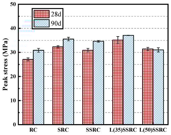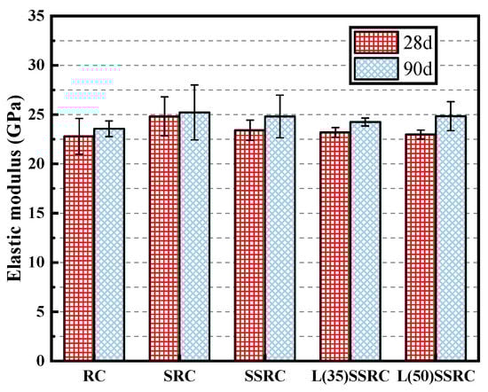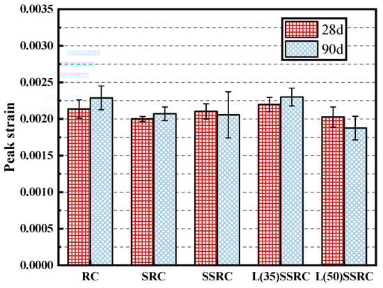 The elastic modulus of each concrete type was calculated according to GB/T 50081-2002 “Standard for Test Methods of Mechanical Properties of Ordinary Concrete” [], that is, the secant slope of 1/3 peak stress and 0.5 MPa in the stress-strain curve. The results are presented in Figure 8. The elastic modulus of concrete using SRCA is increased by 8.9% and 7.0% at 28 and 90 days, respectively, compared to RC. The introduction of seawater and sea sand slightly decreases the elastic modulus of concrete. The incorporation of LC3 also demonstrates slight influence on the value of elastic modulus. However, the elastic modulus of L(35)SSRC and L(50)SSRC are still comparable to those of SSRC. Furthermore, for each concrete type, the elastic modulus of concrete rises with the increase of curing age. As for the peak strain, the usage of SRCA slightly decreases the value, while the incorporation of seawater, sea sand and 35% LC3 further enhance the strain value (Figure 9). It could be concluded that 35% replacement ratio of OPC by LC3 benefits the achievement of both high strength and high strain of concrete using SRCA and SWSS.