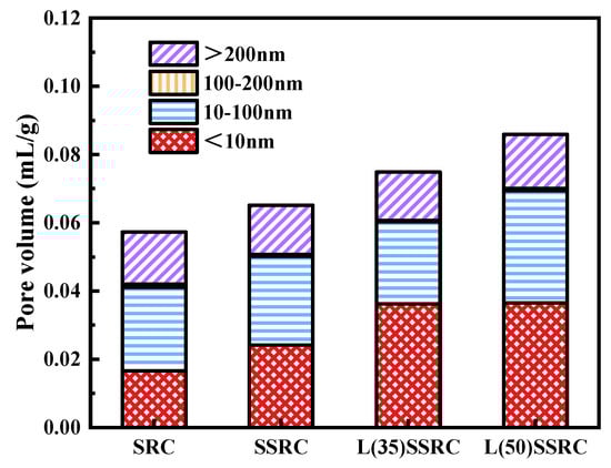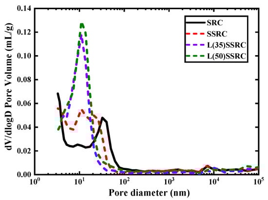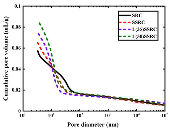 The pore structural characteristics of studied concrete types are presented in Figure 10, Figure 11 and Figure 12. According to the pore size distribution curve, shown in Figure 10, the pores are refined by using SWSS, and the refinement is further significantly improved by incorporating LC3. Etxeberria et al. [,] have reported that the average pore size of concrete using SWSS, and recycled aggregate is reduced compared to recycled concrete using freshwater, which is probably originated from the salts existing in SWSS. The threshold pore size of SSRC matrix is reduced by comparison with that of SRC matrix, as shown in Figure 11. The reduction of the threshold pore size of L(35)SSRC and L(50)SSRC matrix is more significant. Although the total pore volume is increased with the incorporation of both SWSS and LC3, the increment is mainly attributed to the rising of the volume of pores smaller than 10 nm, i.e., gel pores []. The gel pores exhibit negligible influence on the strength of concrete []. Thus, the strength of concrete L(35)SSRC is enhanced compared to SSRC though the total porosity of L(35)SSRC is higher than that of SSRC. While for L(50)SSRC, the volume of pores larger than 10 nm, i.e., capillary pores, is increased compared to L(35)SSRC, the increment of capillary pores is detrimental to the strength of concrete. Correspondingly, the compressive strength of L(50)SSRC is lower than that of L(35)SSRC.