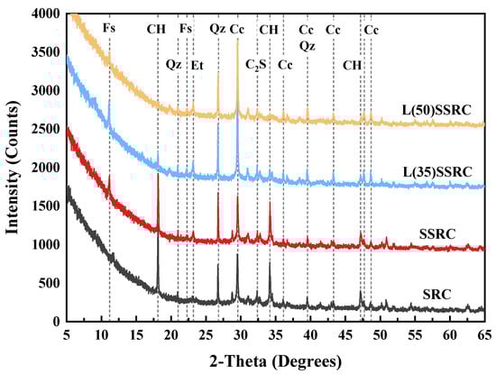 To further investigate the influence of LC3 and SWSS on the microstructure of concrete using SRCA, X-ray diffraction (XRD) analysis was performed to identify the hydration phase assemblages of the four paste types of SRC, SSRC, L(35)SSRC and L(50)SSRC. The pastes were prepared in parallel with the concrete cylinders and cured to 28 days. After the termination of hydration process, the paste was vacuum dried at 60 °C for 24 h. Then, the paste samples were ground into powder before XRD testing. During the test, Cu Kα radiation (λ = 1.54 Å) at 40 kV and 40 mA was applied, and the scanning was performed at a speed of 0.02°/step from 5° to 65°.