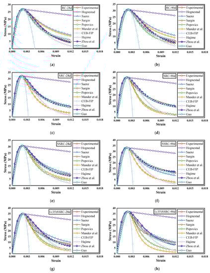 It is remarked that all the models could effectively predict the rising phase of the stress-strain curve. However, neither Hognestad [,] model nor CEB-FIP [] model could effectively predict the descent part of the stress-strain curve, and Hognestad [,] model overestimates the descending part of the curve while CEB-FIP [] model underestimates the descending portion of the curve. For RC, both Saenz [] model and Mander et al. [] model overestimate the decline stage of the curve, while Hajime [] model shows the opposite tendency; although Popovics [] model predicts a stress-strain curve that is close to the experimental results at the age of 28d, it underestimates the decline part of the curve at the age of 90 days. Similarly, models such as Popovics [], Mander et al. [] and Hajime [] underestimate the descending part of the curves of SRC, SSRC, L(35)SSRC and L(50)SSRC. The stress-strain curve predicted by Saenz [] model is relatively close to the experimental results, but the effectiveness of the prediction model varies with the ages. As clearly shown in Figure 14, models such as Sargin [], Zhou et al. [] and Guo [] predict the stress-strain curves that are very close to experimental results for all the concrete types, and the prediction model are effective at the age of both 28 and 90 days. In addition, Saenz [] model can also efficiently predict the stress-strain behavior of SRC.