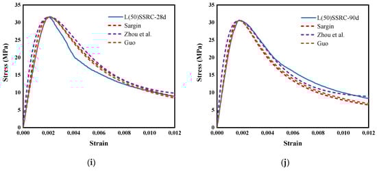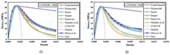 Comparison of existing stress-strain models with experimental results (a) RC-28d, (b) RC-90d, (c) SRC-28d, (d) SRC-90d, (e) SSRC-28d, (f) SSRC-90d, (g) L(35)SSRC-28d, (h) L(35)SSRC-90d, (i) L(50)SSRC-28d and (j) L(50)SSRC-90d.