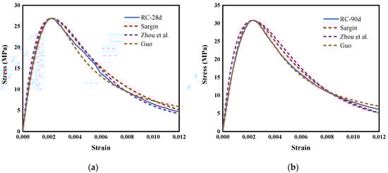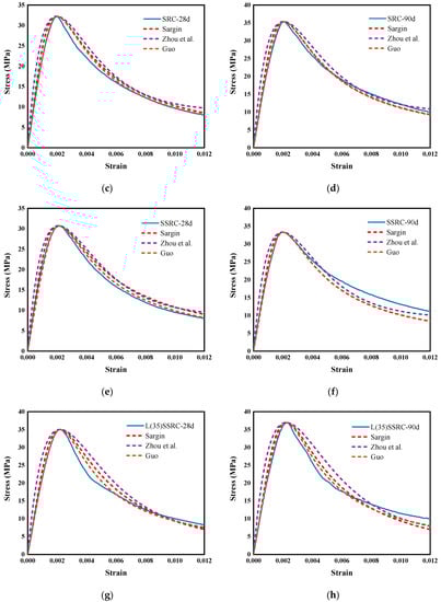 In Sargin [] model, parameter D is used to adjust the softening characteristics of the stress-strain curve. Parameter C in Zhou et al. [] model is used to adjust the shape of the stress-strain curve, and parameters a and b in Guo [] model control the ascending and descending sections of the stress-strain curve, respectively. By comparing the model with the experimental results, the optimal values of the parameters in the model and their correlation coefficients R2 are determined, as shown in Table 9 and Table 10. The comparison between the existing stress-strain analytical models and the experimental results of RC, SRC, SSRC, L(35)SSRC, and L(50)SSRC are demonstrated in Figure 14.