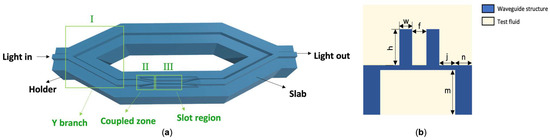 The overall structure is divided into Zone I (Y branch), Zone II (coupled zone), and Zone III (slot zone). The cross-sectional view of the device is shown in Figure 1a, and the longitudinal section of the slot region is shown in Figure 1b. The device is made of polymer and is surrounded by the test liquid. The device is a suspended structure with the following dimensions: w for the waveguide width on both sides of the slot, h for the slot height, f for the slot width, m for the holder height, n for the holder width, and j for the distance between the slot and the two holders. The device was supported by brackets on both sides of the waveguide and a slab, which formed a suspended structure and realized a buried structure inside the liquid. This construction increases the contact area between the waveguide and the liquid being monitored. Meanwhile, the slot structure is used to improve the interaction between the liquid sample and the optical wave evanescent field, hence, boosting the sensor’s sensing accuracy. Based on the aforesaid structure, the device will not only be analyzed in terms of optical power ration, energy loss, and performance, but also be optimized in terms of device parameters, waveguide mode, and optical field.
