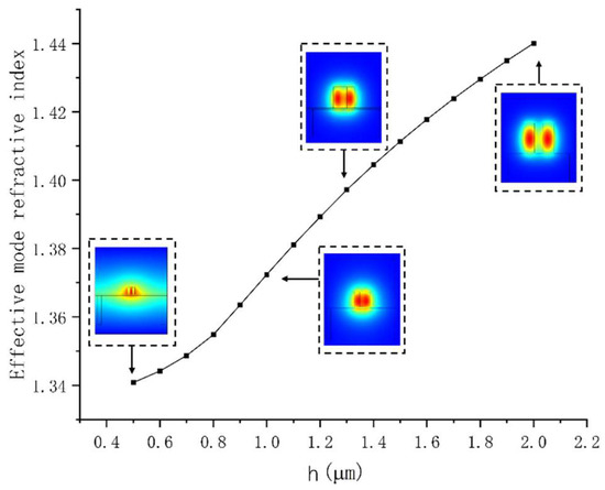 The as functions of h for the section dimension as 2 µm × 2 µm. Insets: the distribution of the optical fields when h = 0.5 µm, h = 1.0 µm, h = 1.3 µm, and h = 2.0 µm, respectively.