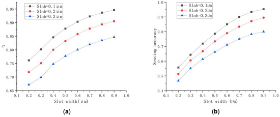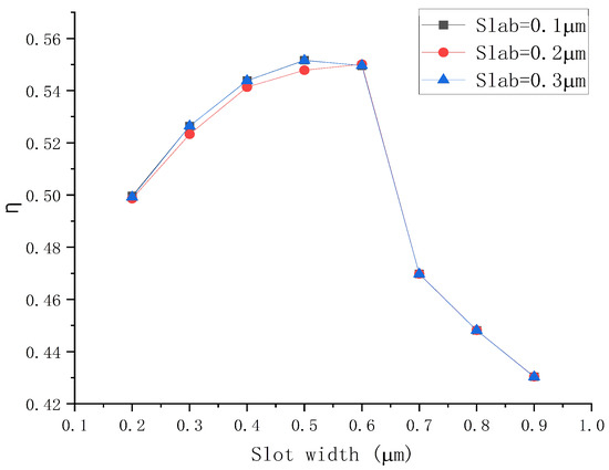 Relationships between η and slot width with different slab sizes are shown in Figure 3a, indicating that when the slot widths vary from 0.2 to 0.9 µm, the corresponding values of η for slab sizes of 0.1, 0.2, and 0.3 µm range from 0.76118 to 0.94623, 0.71795 to 0.90513, and 0.67193 to 0.84676, respectively. The value of η reaches 0.94623 when the slot width is 0.9 µm with slab thickness of 0.1 µm, surpassing that of the other two slab sizes.