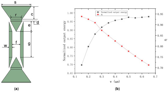 In brief, it can be concluded that as the slot width keeps increasing, and η are rising. However, with the increase in slot width, the limitation of the optical field decreases, so the structure was adopted with a slab thickness of 0.1 µm and a slot width of 0.7 µm for further study. The increase in the value of η means the decreasing limitation of the optical field and larger coupling loss during the coupling process. Hence, the coupling structure was optimized using the finite element method for simulation, and the coupling structure we designed is illustrated in Figure 4a. Subsequently, the normalized output energy (Iout) and η corresponding to the width of waveguide on both sides of slot (w in Figure 4a) were calculated. The results are shown in Figure 4b. When w is between 0.15 and 0.65 µm, the value of η varies from 0.93848 to 0.71262 and increase from 0.69720 to 0.97826. Consequently, it can be obtained that is positively correlated with η. To maximize device performance, taking slot parameters the posterior end of oraconaris length (s) = 2 µm, the fore part of oraconaris length (r) = 0.8 µm, the length of oraconaris (c) = 75 µm, the length of the syntaxial waveguide (d) = 25 µm, the length of coupling point (e) = 135 µm, the slot width (f) = 0.7 µm, the slot length (g) = 500 µm, and the waveguide width on both sides of the slot (w) = 0.25 µm, the normalized output energy (Iout) of 0.8768 corresponds the value of η = 0.9095.