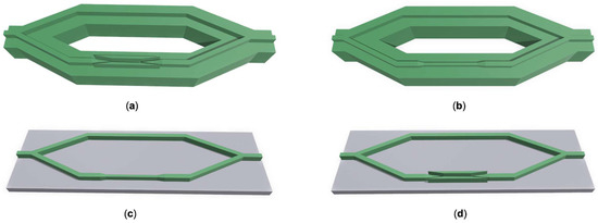 The optimization analysis of the overall MZI structure was subsequently performed. The device was designed with branch interval of 10 µm, arm length of 2045 µm, and branch span of 700 µm. Furthermore, we investigated the device sensitivity () of the suspended MZI with the slot waveguide (Figure 6a), the suspended MZI with the strip waveguide (Figure 6b), the MZI with the strip waveguide on the substrate (Figure 6c), and the MZI with the slot waveguide on the substrate (Figure 6d). All their cladding is liquid, the structures in Figure 6a,d show the adopted slot waveguide, the structures in Figure 6b,c show the adopted strip waveguide. The structures on substrates with the refractive index of 1.33 are shown in Figure 6c,d.