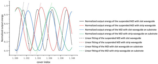 where is the sensitivity of the sensor and is the refractive index of the test medium. L is the length of the branched arm, is the operation wavelength. and are the effective refractive indexes of two branched arms. We selected salt solution as the liquid analyte to be tested. When the mass fraction of the salt solution varied from 12.5% to 17.5%, the reflective index changed from 1.33 to 1.34. The schematic of different structures is shown in Figure 6, and the connections between and are illustrated in Figure 7. The suspended MZI sensor with a slot waveguide has an average sensitivity of 972.1 dB/RIU and an average detection resolution of 1.6 × 10−6 RIU. The suspended MZI sensor with a strip waveguide has an average sensitivity of 652.3 dB/RIU and an average detection resolution of 1.5 × 10−6 RIU. The average sensitivity of an MZI sensor with a strip structure on a substrate is 460.1 dB/RIU, and the average detection resolution is 2.2 × 10−6 RIU. The MZI sensor with a slot structure on the substrate has an average sensitivity of 601.6 dB/RIU and an average detection resolution of 1.6 × 10−6 RIU. It can be concluded that the average detection resolution of the suspended MZI sensor based on the slot structure we designed is about 1.5 times higher than that of the suspended strip waveguide structure, 1.6 times higher than that of the non-suspended slot structure, and 2.1 times higher than that of the non-suspended strip waveguide structure. Figure 8 illustrates the simulated optical field of different structures.
