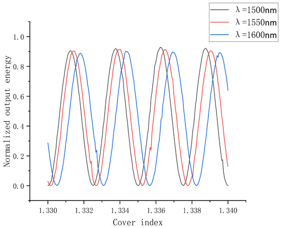 The relationship between the normalized output energy with the refractive index for the structure at wavelengths of 1500, 1550, and 1600 nm.