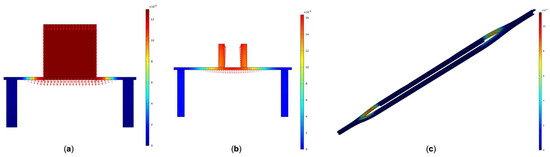 For suspended structures, a solid support is essential to keep the device from collapsing owing to its gravity. The slabs and the holders were designed for supporting the device, but it will lead to the leakage of the light field. To ensure the stability of the device and explore the influence on the reflective index exerted by the deformation of the structure, mechanical simulation analysis was conducted on the above size of the polymer device using the finite element method. We calculated the deformation of the entry position of the central coupling region, the slot waveguide, and entire 3D device structure. The schematic diagram of the mechanical analysis of the device is shown in Figure 10. The most severe deformations of the entry position of the central coupling region (Figure 10a) and the slot waveguide (Figure 10b) are only 1.29 × 10−4 and 1.57 × 10−4 µm, proving that the optimized device has good bearing capacity and can maintain a stable suspended structure. Moreover, it can be known that the deformation of the sensing arm with a slot waveguide and the sensing arm with a straight waveguide is numerically similar, so the influence exerted by the deformation of each sensing arm on the effective refractive index is of the same order of magnitude, which can counteract each other in the calculation of the phase difference. The deformation of the 3D device structure (Figure 10c) is 0.01 µm in the Y branch region. The deformation mainly occurs at the Y branch. However, it has no effect on the phase difference and output of the device due to its symmetry.
